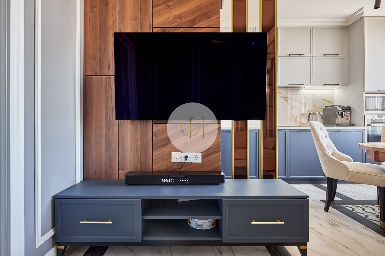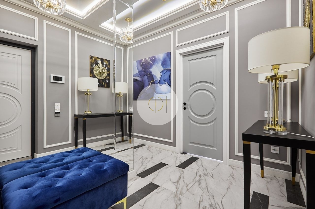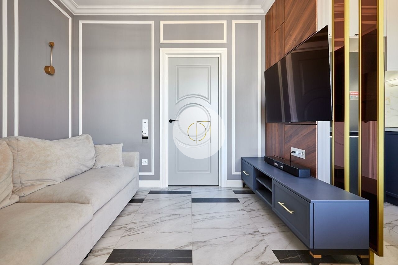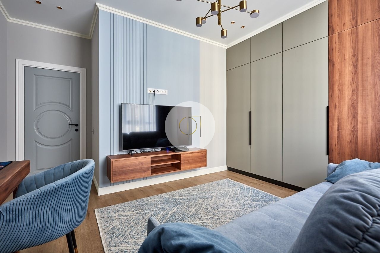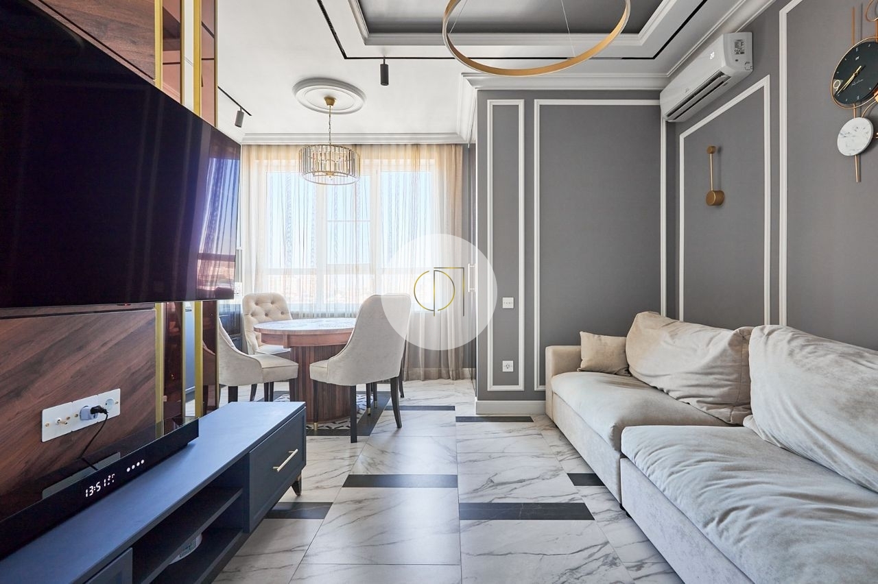 Планировка: общ. S= 70 кв.м, 1 изолированная комната и кухня-гостиная, с/у, просторная витражная лоджия. Высота потолков 2,80 м. Состояние квартиры - дизайнерский ремонт.Люстры и подвесные светильники Odeon и Maytoni, трековые светильники Infinity system, лепнина Orac Decor, вся мягкая мебель Dantone Home, кухонный гарнитур AEG, техника LG, межкомнатные Ягуар.