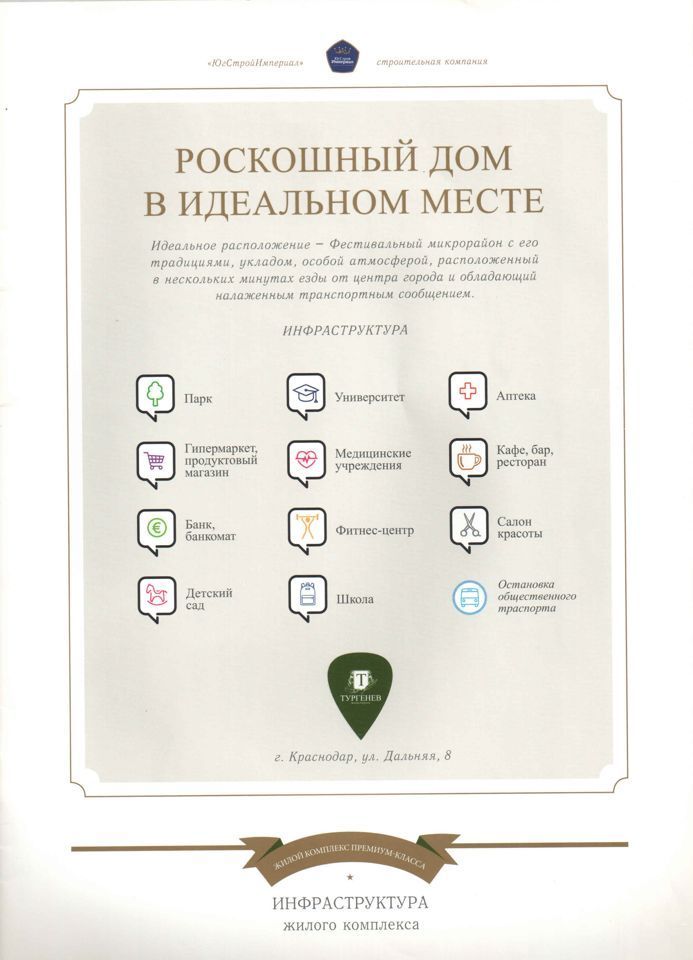 Развитая инфраструктура: кафе, рестораны, фитнес клубы, торговые центры, лучшие клиники в городе, супермаркеты, магазины, аптеки, прогулочные зоны, двор, оборудованный детскими площадками, подземный и наземный паркинги, консьерж и охрана, камеры видеонаблюдения.