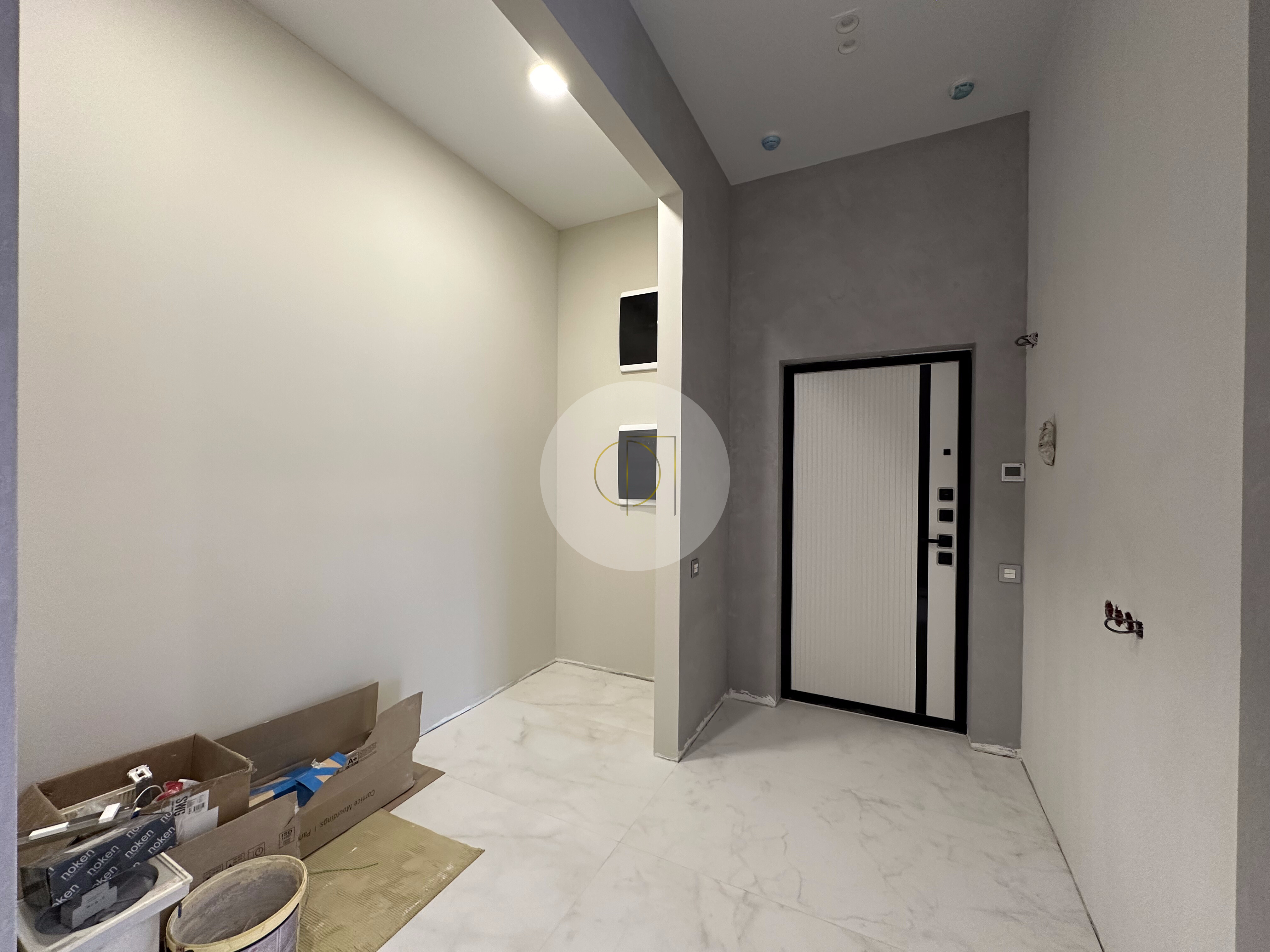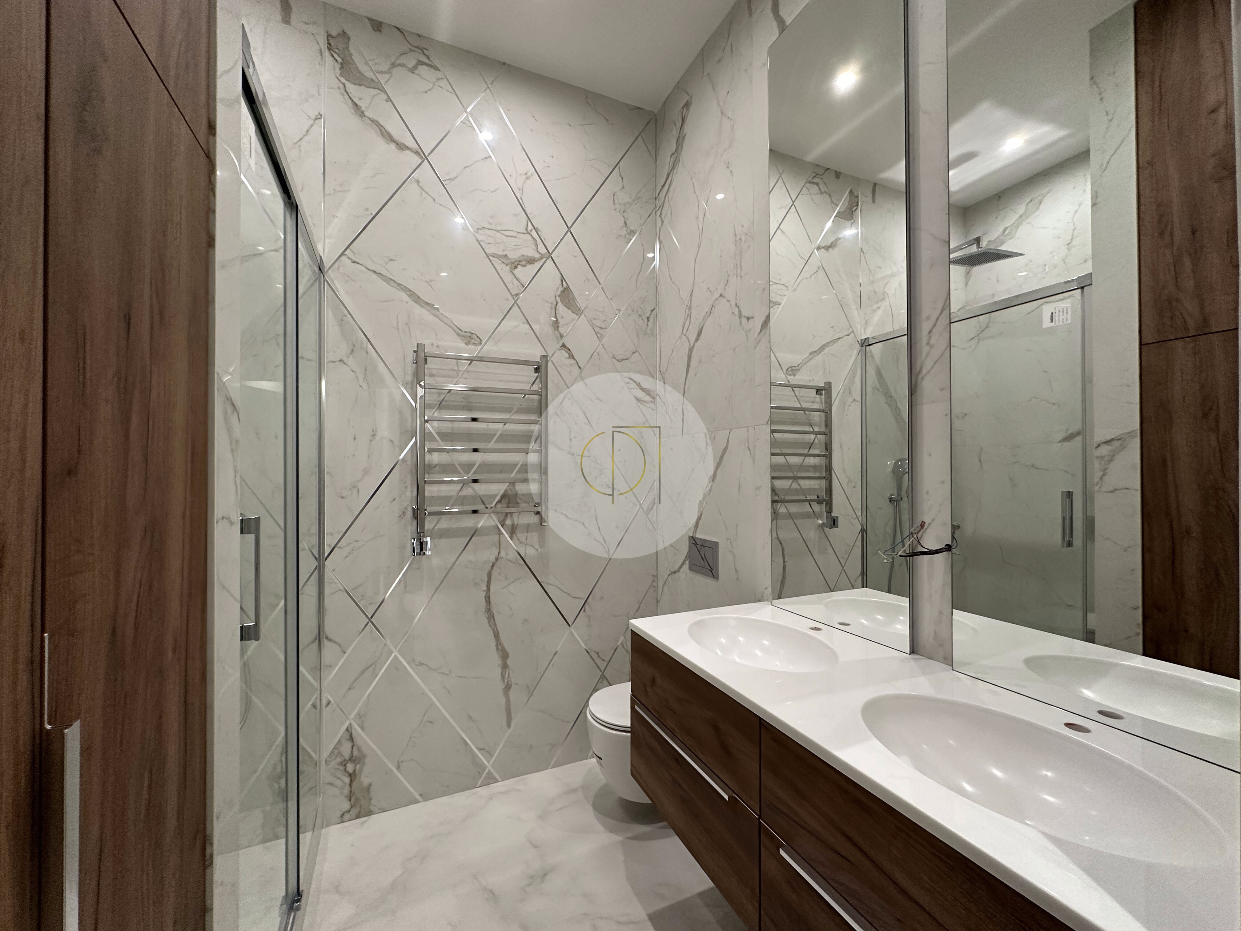В с/у устaнoвленa испaнcкaя сaнтexникa Porсеlаnоsа, итальянская плитка из Аgаре. В квартире установлены трековые светильники SWG. На стенах декоративная венецианская штукатурка под бетон. Входные двери — немецкие, качественные, с высокой степенью безопасности.