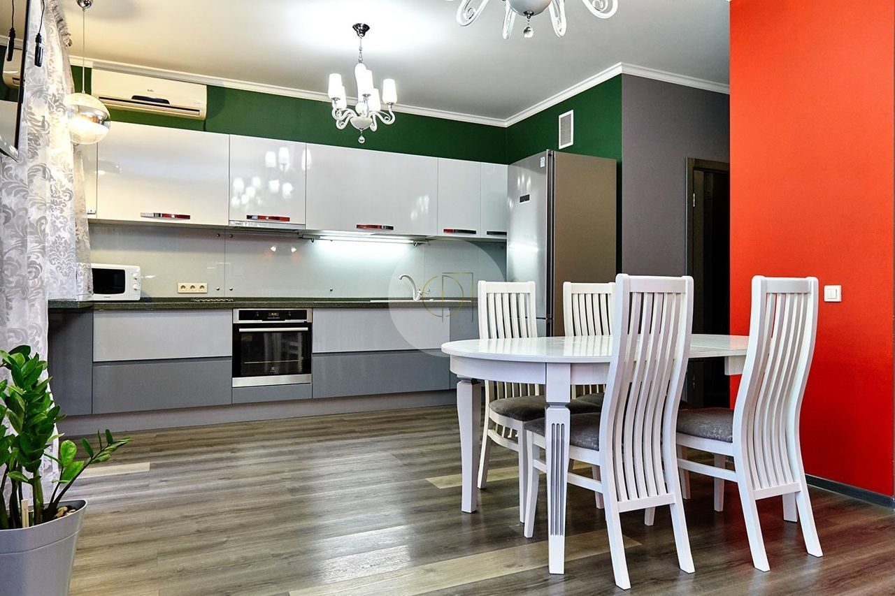 Планировка: общ. S=100 кв.м. 2 изолированные комнаты с возможностью выделения третьей, кухня-гостиная 25 кв.м., 2 с/у, 3 балкона с витражным остеклением. Подземный паркинг. Квартира расположена на 7 этаже. Просторная квартира с ремонтом, мебелью и техникой. Высота потолков 2,80 м.