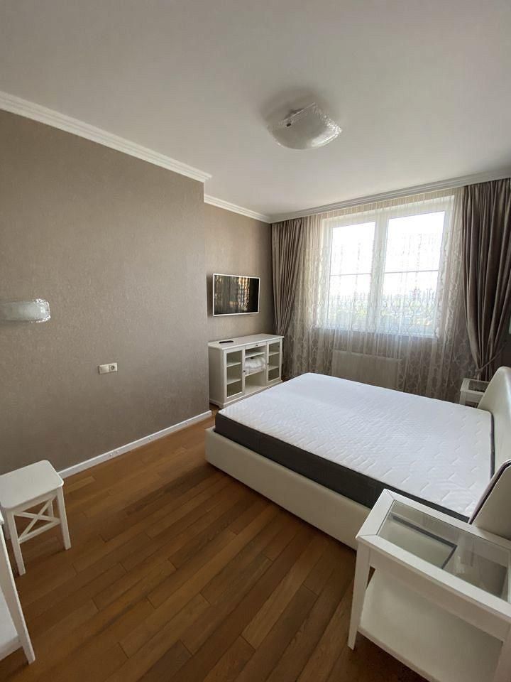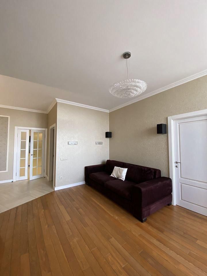 Квартира расположена на 14 этаже. Планировка квартиры: общая пл 130 кв м, кухня, гостиная , мастер-спальня со своей гардеробной и санузлом с окном на реку, две детские спальни, санузел с постирочной комнатой, прихожая.Высота потолков 3 м.