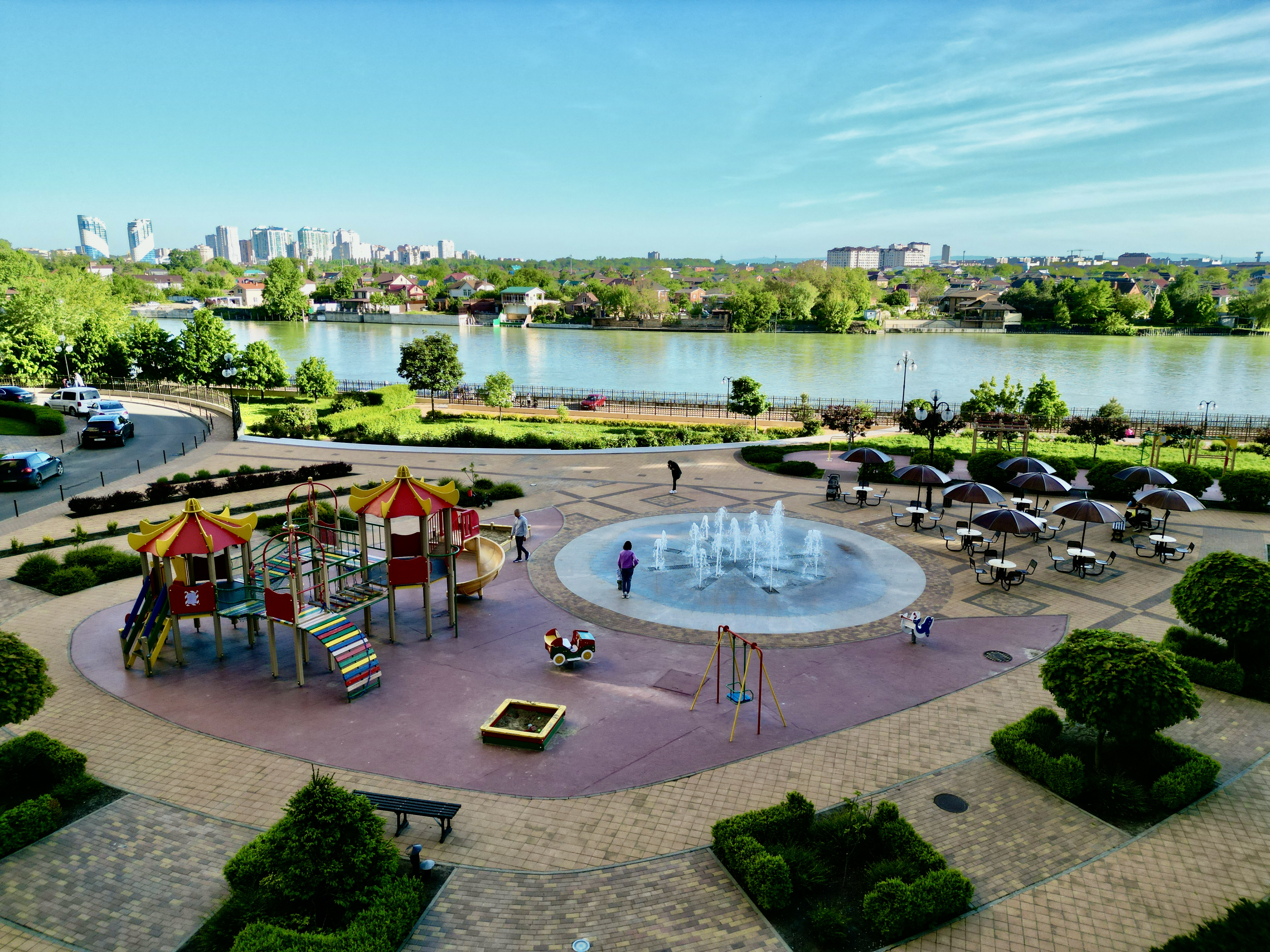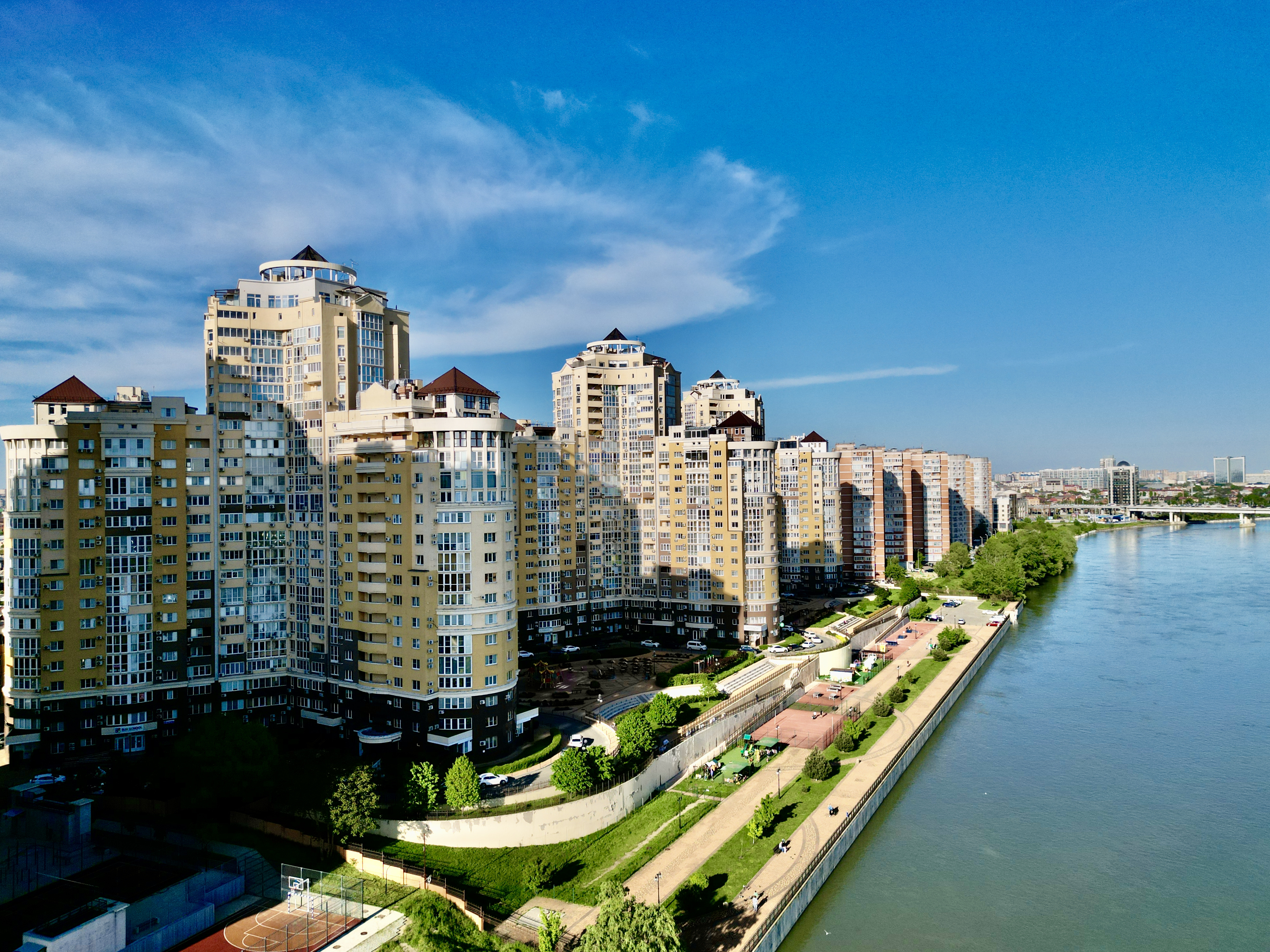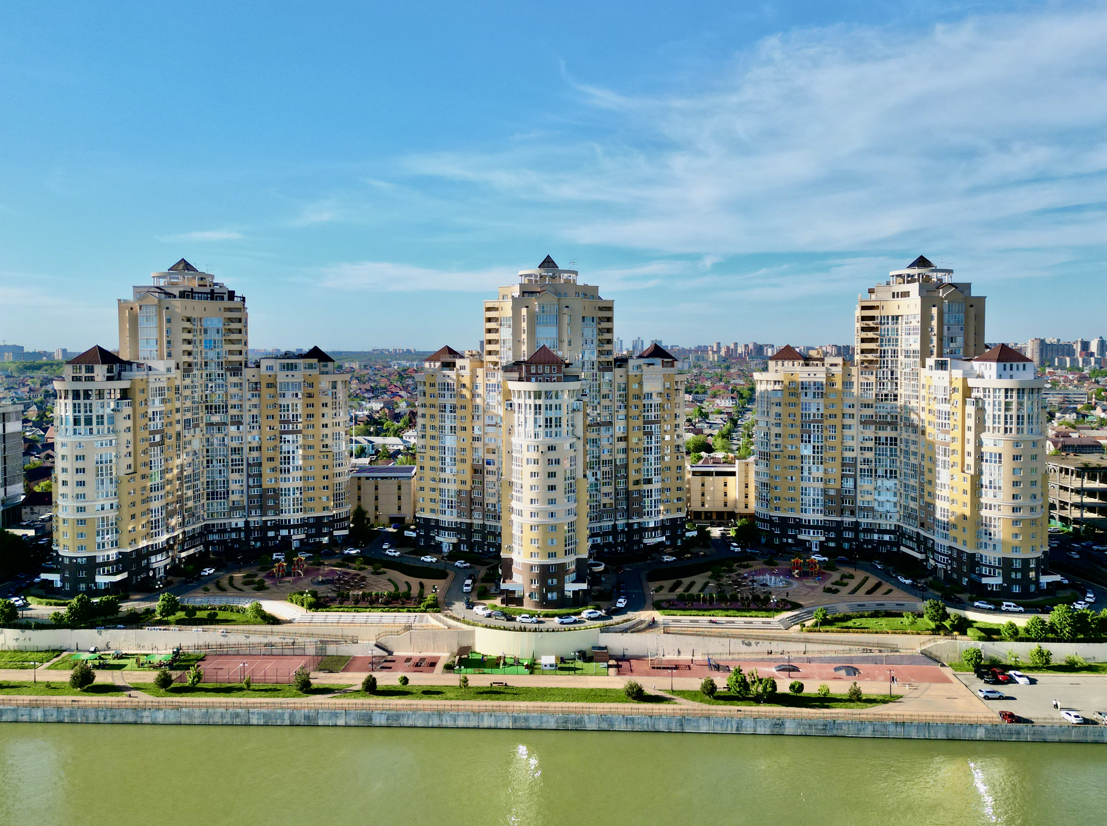 ЖК ЕВРОПЕЙСКИЙ на улице Кожевенная. Комплекс расположен на первой линии реки Кубани. Этот квартал бизнес-класса спроектирован так, что окна большинства квартир выходят на набережную. На огороженной и охраняемой территории создано пространство для игр, отдыха и спорта с фонтанами и пешеходными дорожками.