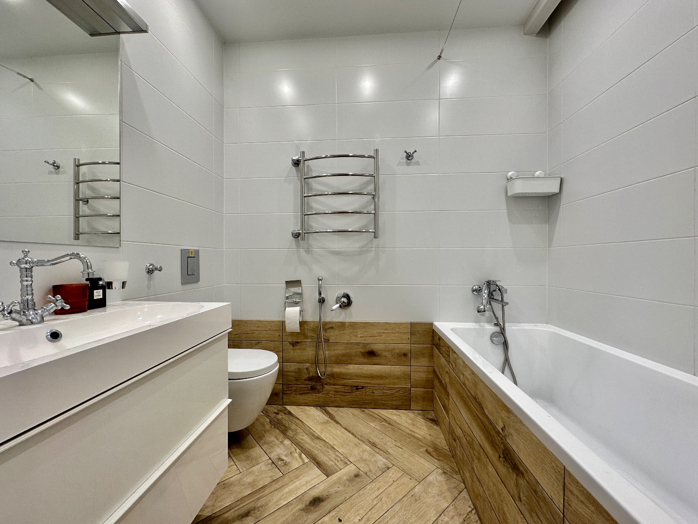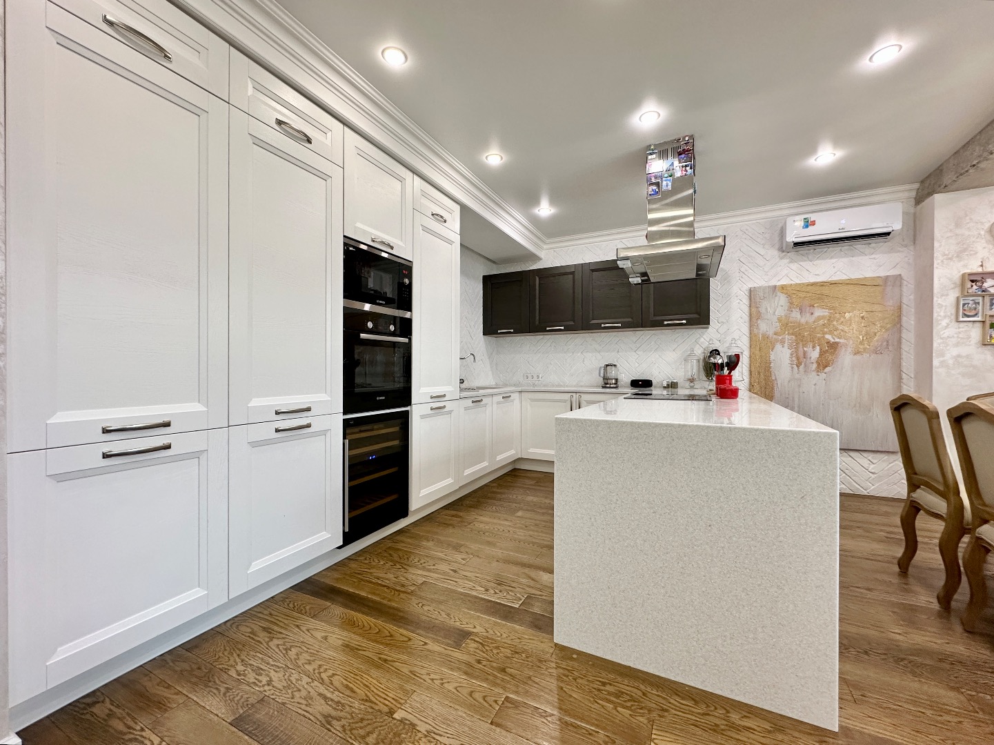 Современная дизайнерская кухня полностью укомплектована техникой: два холодильника, посудомоечная машина, варочная панель, вытяжка, духовой шкаф, микроволновая печь. Установлена система от протечки воды, бойлер, стиральная машина с функцией сушки.