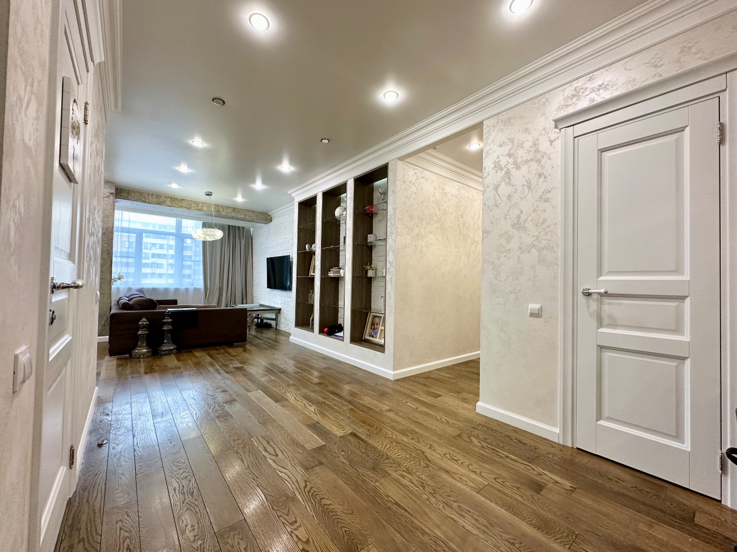 Квартира расположена на 11 этаже. Планировка: общ. S= 131 кв.м, 3 отдельные спальни (две спальни со своими гардеробными), кухня-гостиная 32 кв.м, 2 санузла (один с душевой кабиной, второй с ванной), гардеробная при входе, просторный холл и коридор.