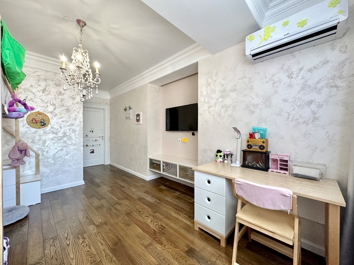 В квартире выполнен дизайнерский ремонт, полностью укомплектована техникой и мебелью. Установлен теплый пол. Видеодомофон, в каждой комнате установлены кондиционеры. Каждое пространство квартиры продумано опытными дизайнерами и компанией, воплотившей ремонт.