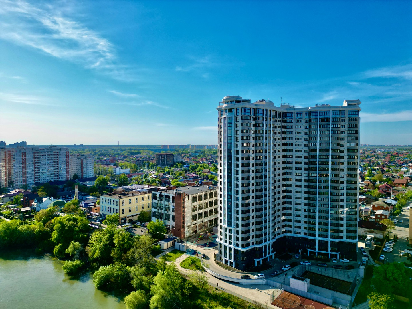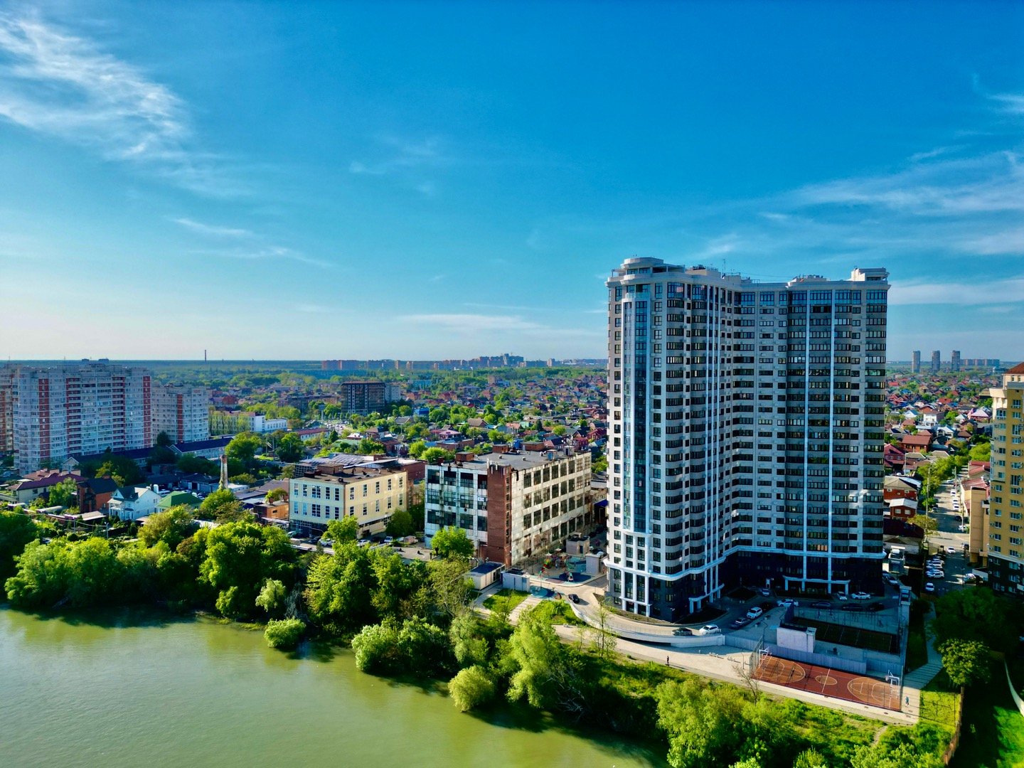 ЖК Европейский на улице Кожевенная. Комплекс расположен на расположен на первой линии реки Кубани. Этот квартал бизнес-класса спроектирован так, что окна большинства квартир выходят на набережную. На огороженной и охраняемой территории создано пространство для игр, отдыха и спорта с фонтанами и пешеходными дорожками.