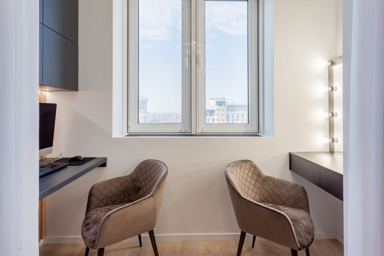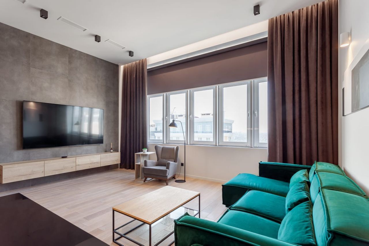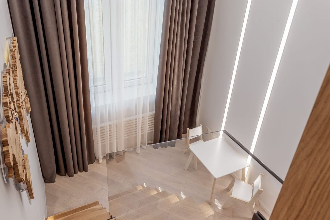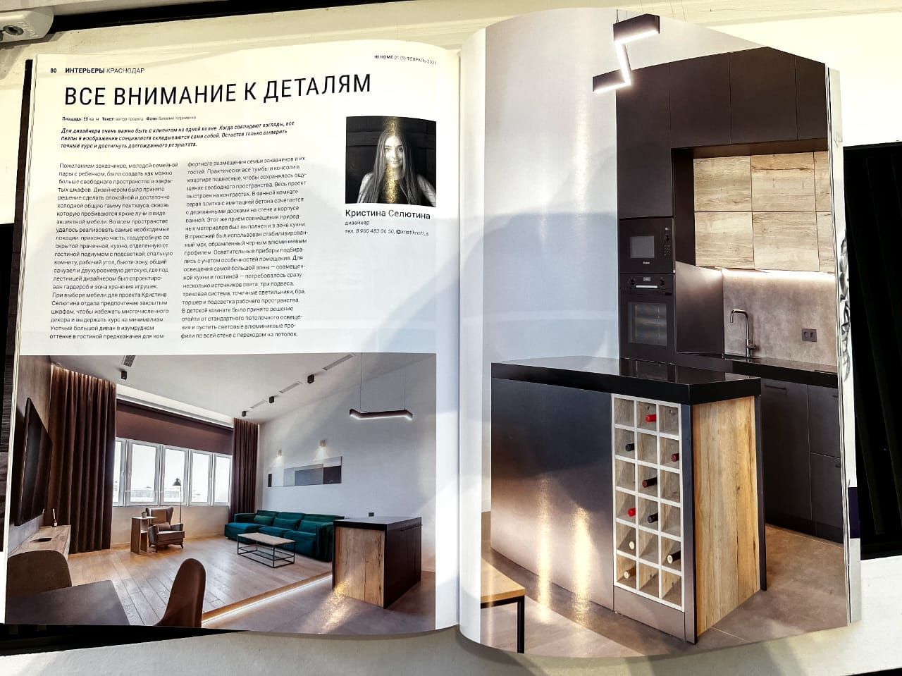 Ремонт и мебель делали по дизайн проекту известного краснодарского дизайнера интерьеров. Вся мебель в квартире сделана под заказ из лучших импортных материалов, по эскизам дизайнера. Пентхаус выполнен в стиле минимализм.