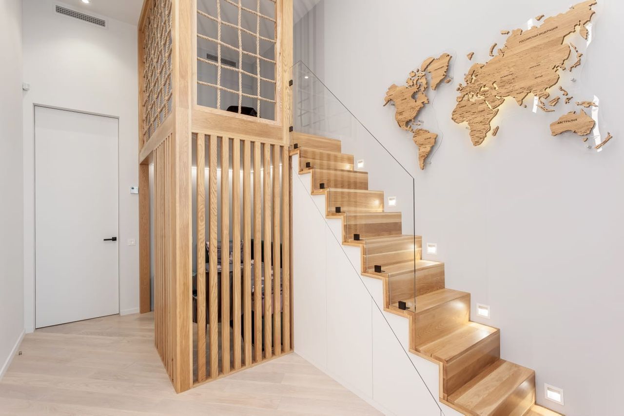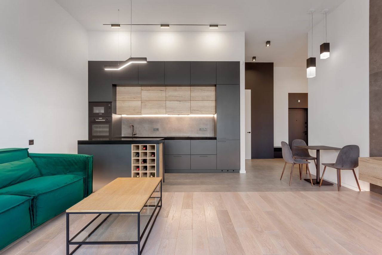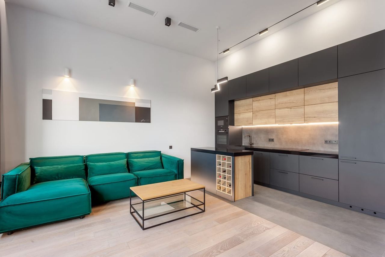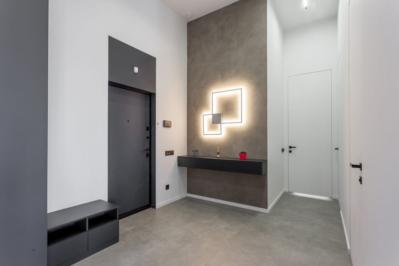 Ремонт и мебель делали по дизайн проекту известного краснодарского дизайнера интерьеров. Вся мебель в квартире сделана под заказ из лучших импортных материалов, по эскизам дизайнера. Пентхаус выполнен в стиле минимализм.