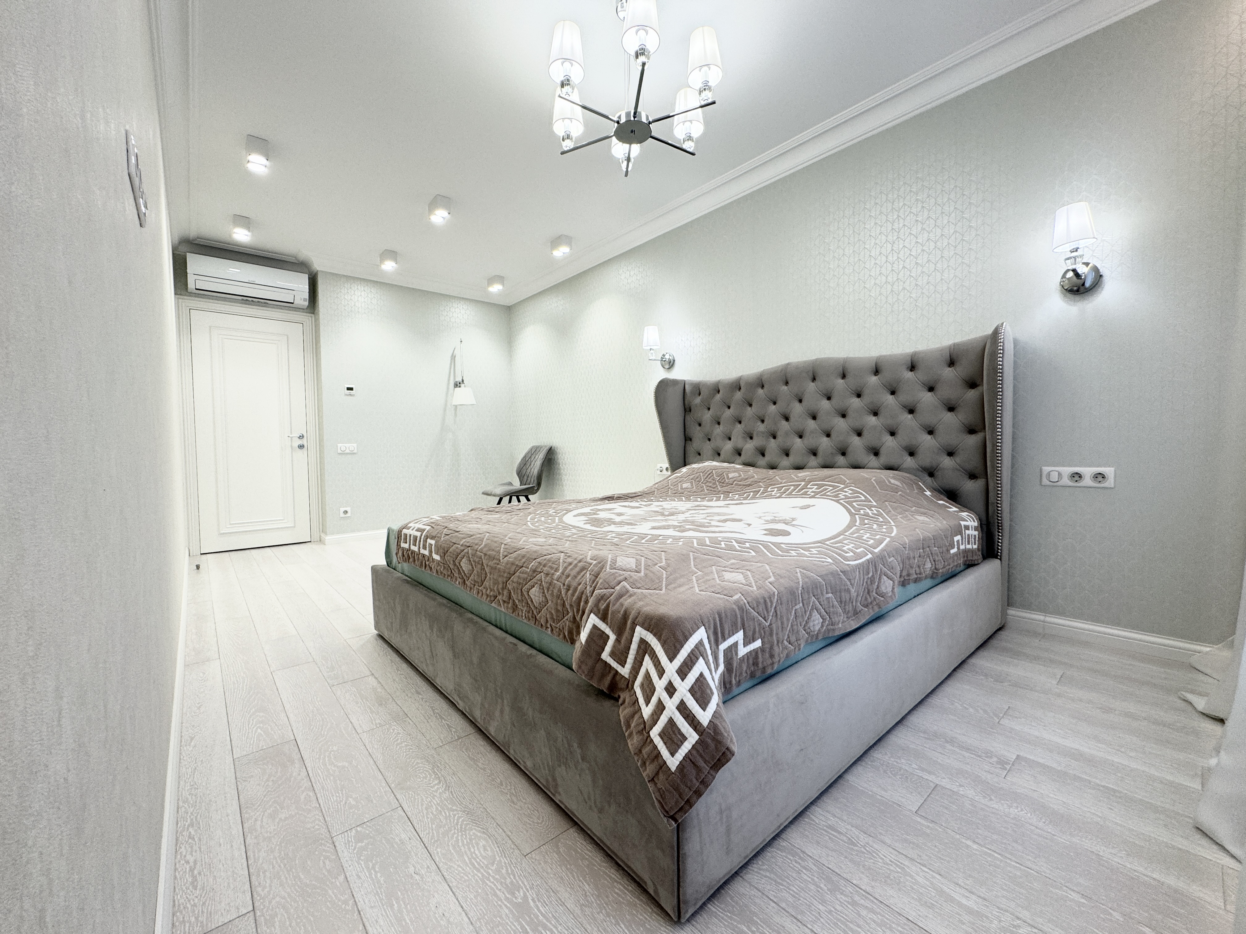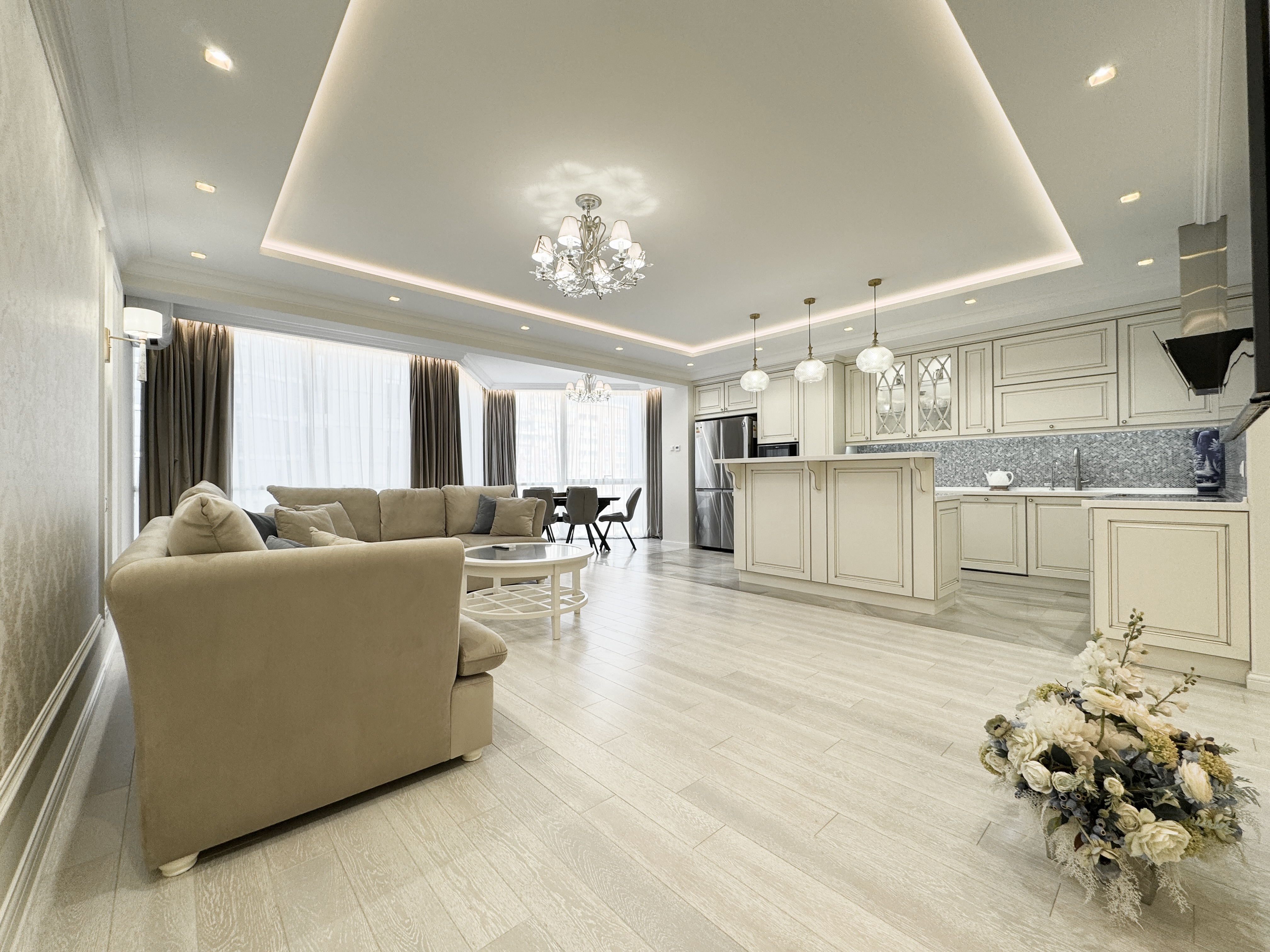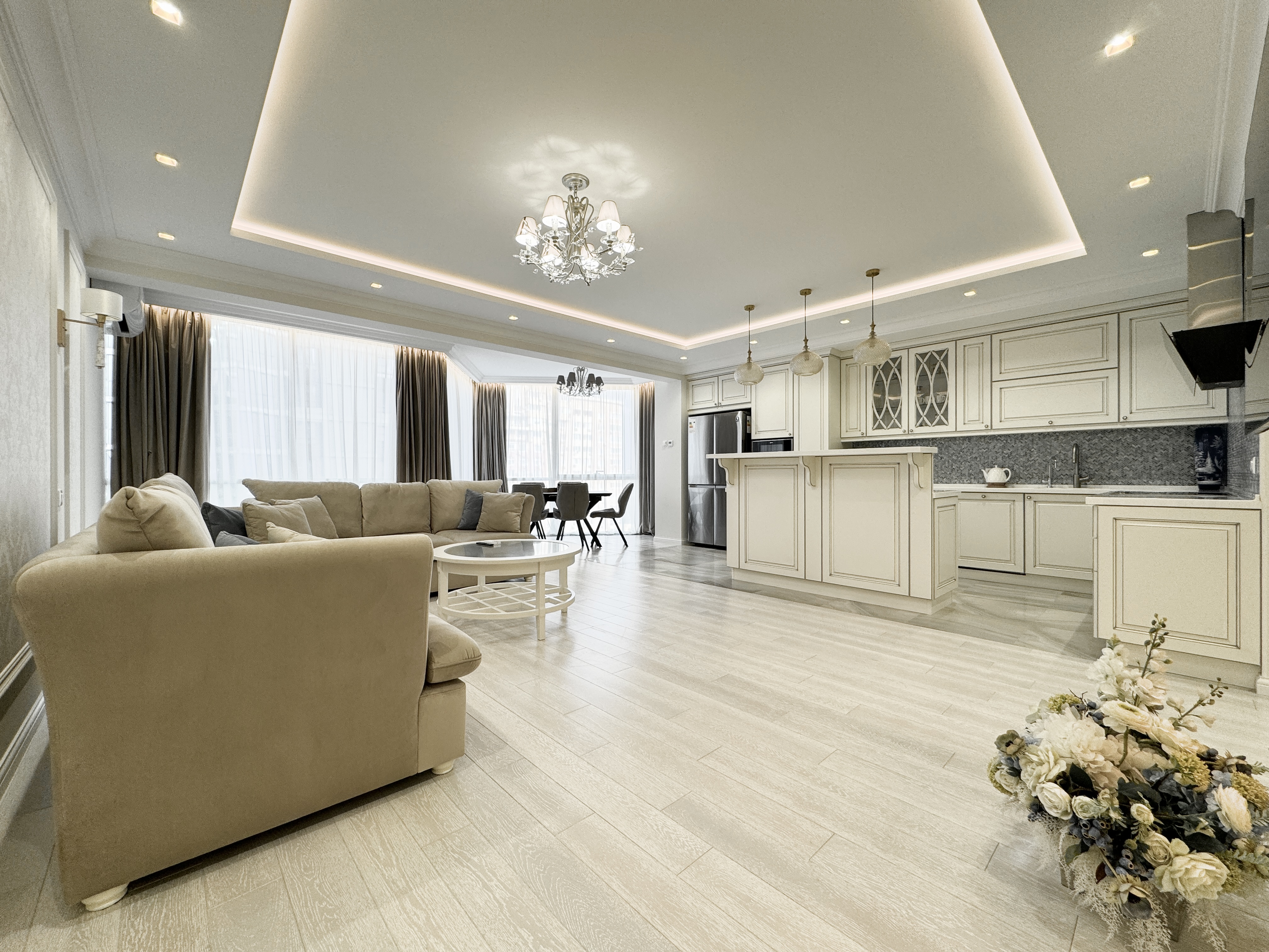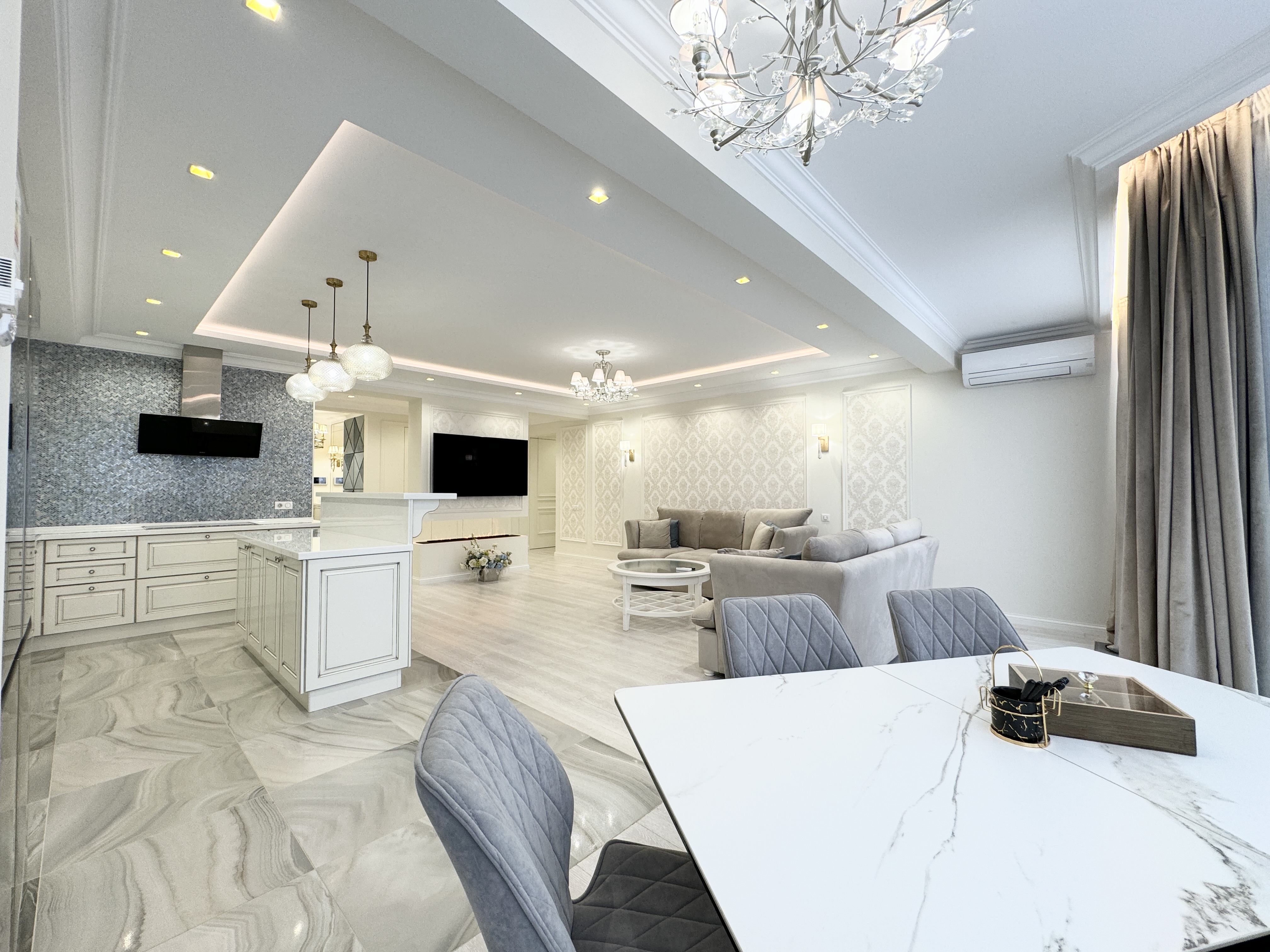 Закрытая территория комплекса. Подземный паркинг с возможностью спуска на лифте. Квартира расположена на 7 этаже. Планировка: общ. S=128,7 кв. м, 2 изолированные комнаты и кухня-гостиная, 2 с/у. Высота потолков 2,80 м. Состояние квартиры - выполнен дорогой, качественный ремонт, квартира продается со всей мебелью и техникой. Состояние почти никто не жил. В кухне гостиной установлен большой бто-камин, что добавляет пространству уюта.