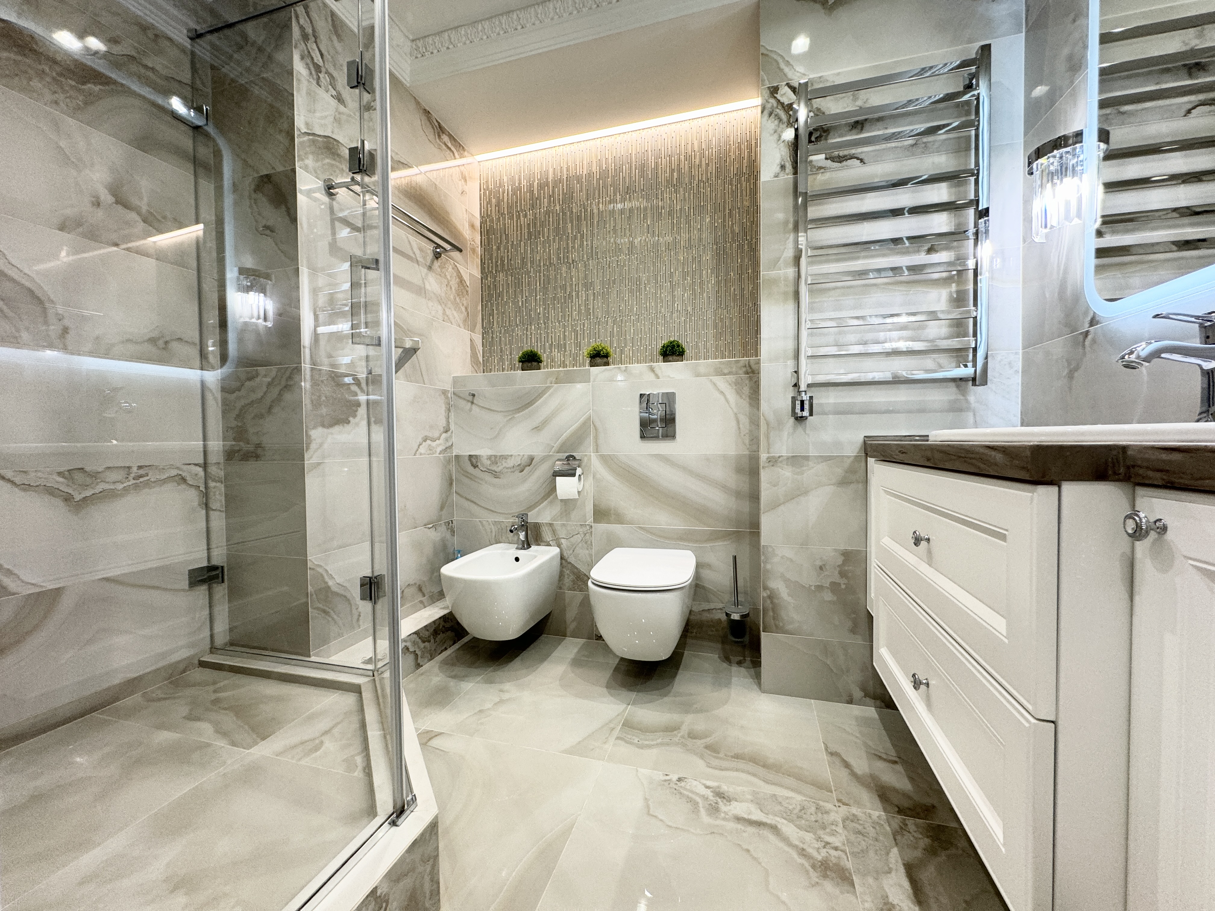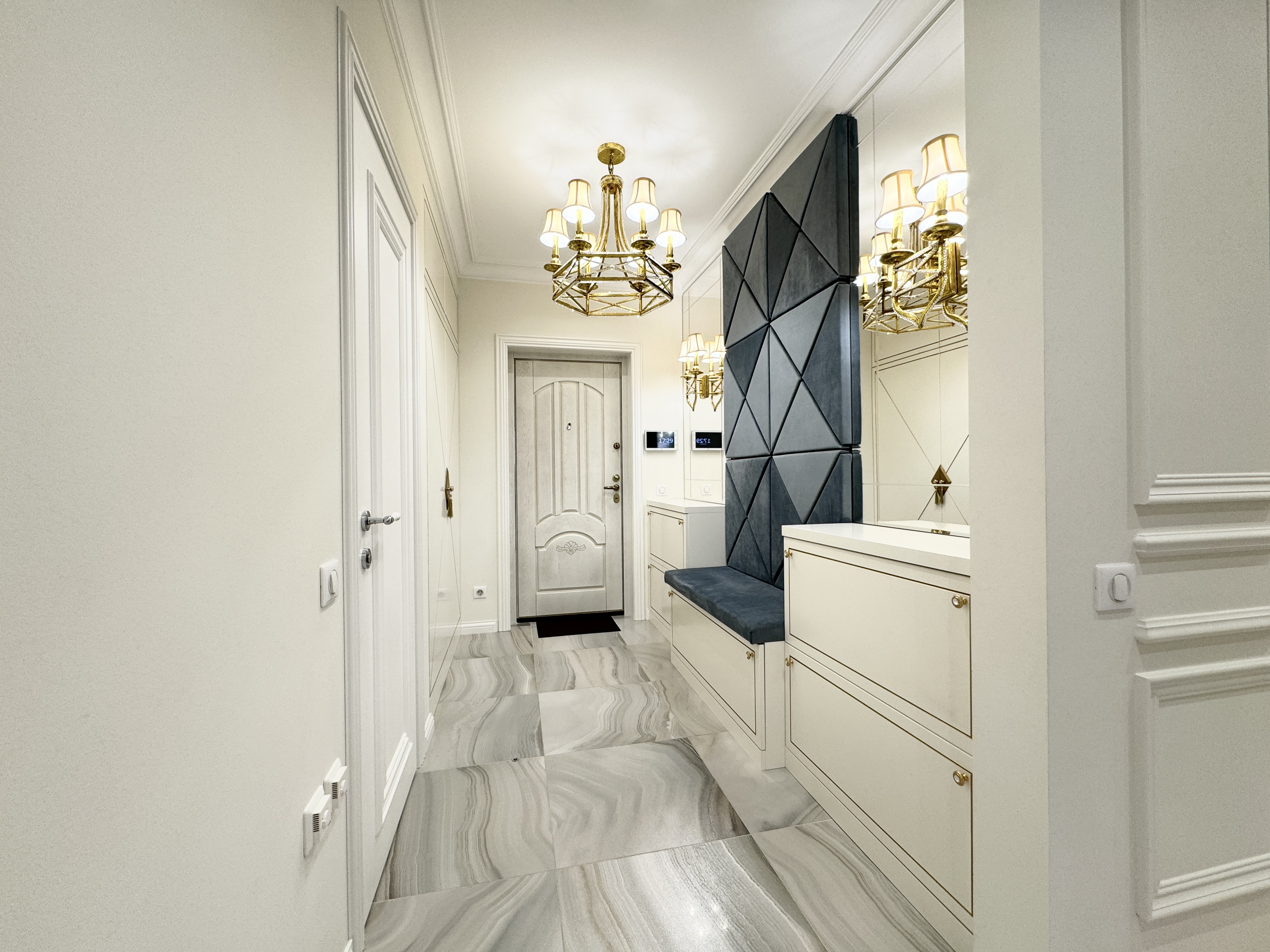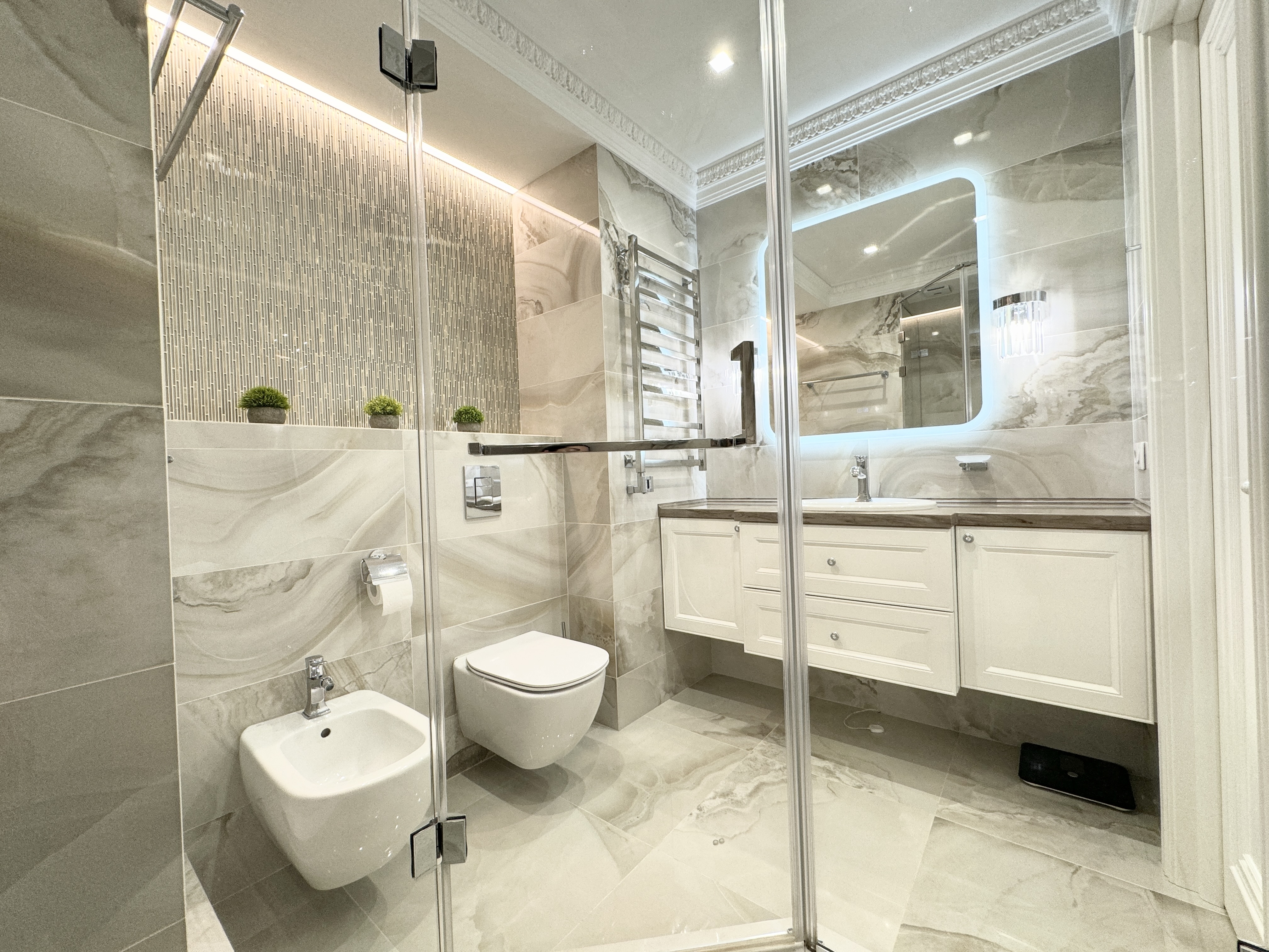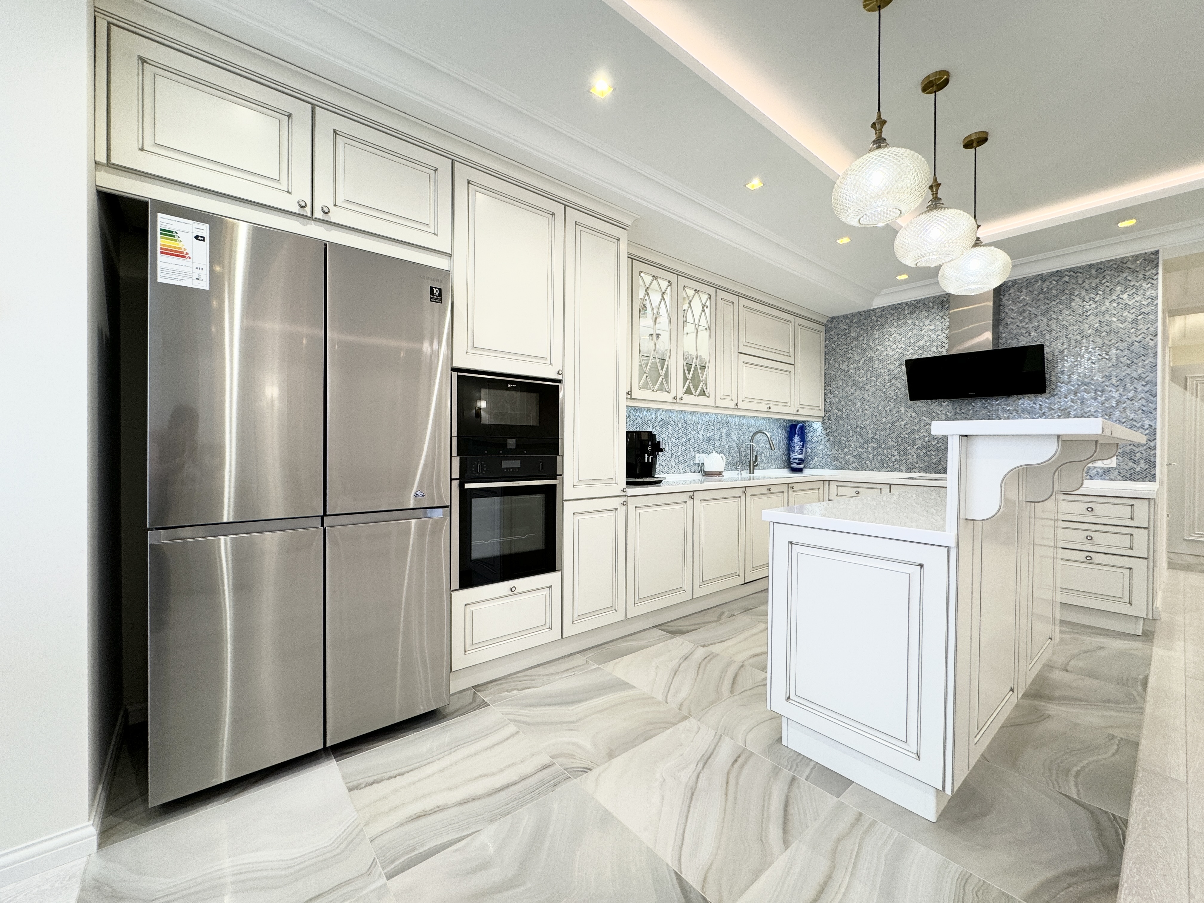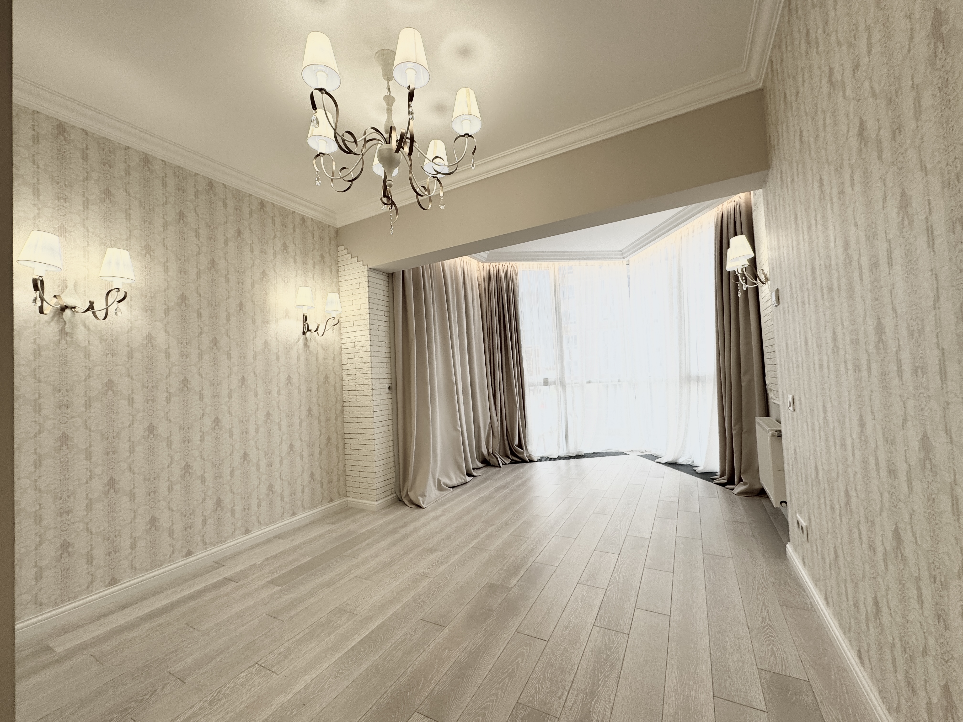 Закрытая территория комплекса. Подземный паркинг с возможностью спуска на лифте. Квартира расположена на 7 этаже. Планировка: общ. S=128,7 кв. м, 2 изолированные комнаты и кухня-гостиная, 2 с/у. Высота потолков 2,80 м. Состояние квартиры - выполнен дорогой, качественный ремонт, квартира продается со всей мебелью и техникой. Состояние почти никто не жил. В кухне гостиной установлен большой бто-камин, что добавляет пространству уюта.